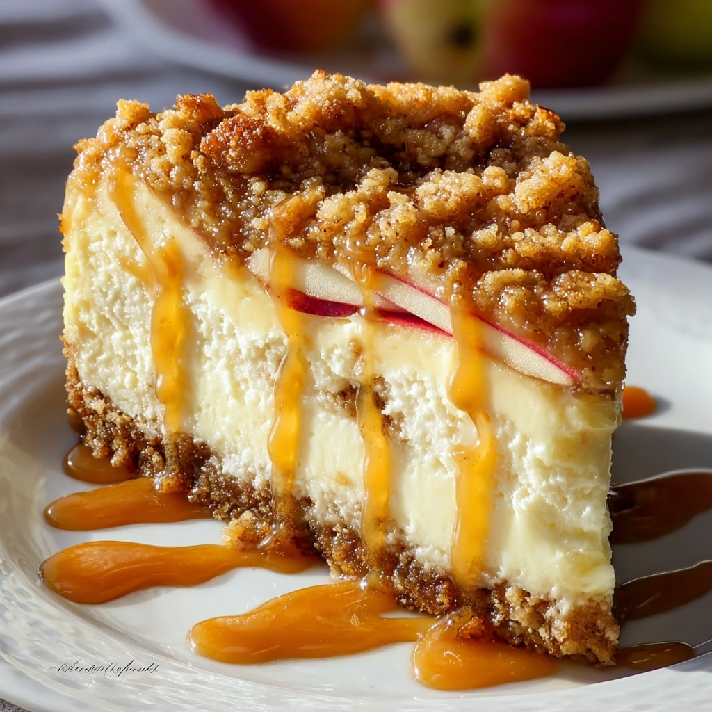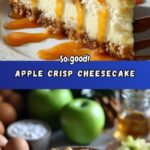This Apple Crisp Cheesecake combines the warm, comforting flavors of cinnamon-spiced apples with a creamy cheesecake filling atop a buttery graham cracker crust, topped with a crisp oat crumble and served with salted caramel sauce for an indulgent dessert perfect for any occasion.