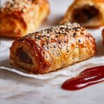 Preheat your oven to 200°C (390°F). Bake the sausage rolls for about 40-50 minutes until they’re puffed, crisp, and golden all over. Keep an eye on them towards the end to avoid over-browning. Once baked, allow them to rest for 5-10 minutes before slicing.