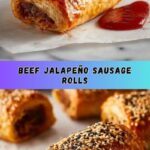 These Beef Sausage Rolls are packed with flavorful ground beef, spicy jalapeños, and a cheesy blend of cheddar and parmesan, all wrapped in buttery puff pastry. Perfectly golden and crispy on the outside, juicy and savory on the inside, they make an ideal snack or party appetizer.