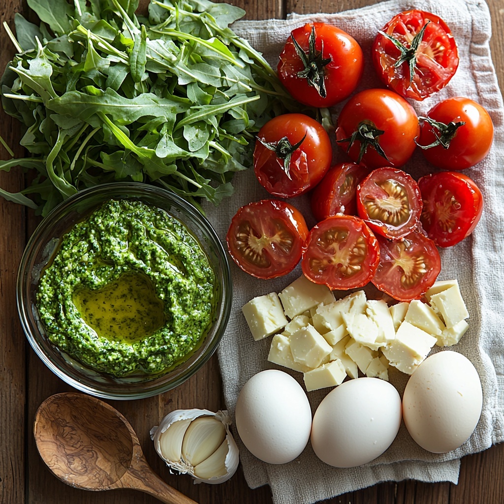 Gently fold the roasted tomatoes, torn arugula, crumbled goat cheese, and cooled onion-garlic mixture into the egg and pesto blend. Make sure everything is evenly distributed without overmixing, so each bite gets a bit of every delightful flavor and texture.