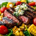 This Balsamic Steak Gorgonzola Salad with Grilled Corn is a vibrant and satisfying dish featuring tender marinated flank steak, sweet smoky grilled corn, and a tangy balsamic dressing. Tossed with fresh mixed greens, cherry tomatoes, red onion, and topped with creamy Gorgonzola cheese and fresh basil, it’s a perfect gluten-free main course for a hearty summer meal.