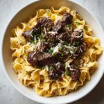 Reheat gently on the stovetop over low heat, adding a splash of beef stock or pasta water to bring back the sauce’s creaminess. Avoid the microwave if possible, as slower reheating helps maintain the tenderness of the beef and prevents the cream sauce from breaking.