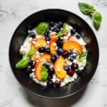 Crumble the feta cheese into small, bite-sized pieces and evenly sprinkle it over the fruit. The creamy, salty feta contrasts beautifully with the sweetness of the blueberries and peaches.