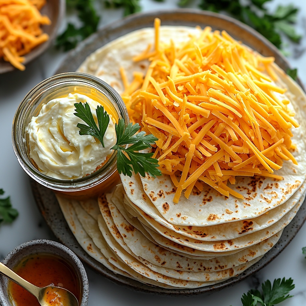 - Assemble Quesadillas: Spread a generous layer of the buffalo chicken mixture over one half of each flour tortilla. Sprinkle shredded cheddar cheese over the chicken mixture, then fold the tortilla in half to enclose the filling.