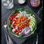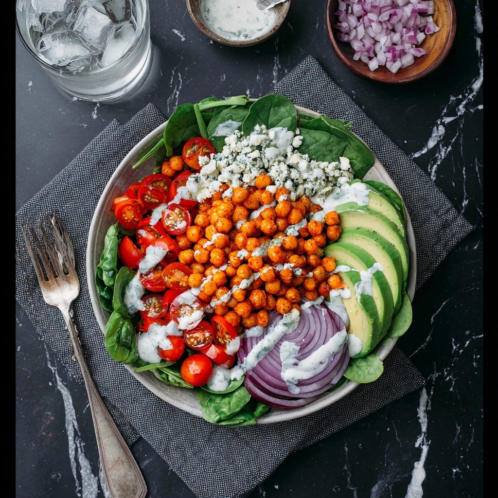 This Buffalo Chickpea Salad is a vibrant, protein-packed dish perfect for a healthy lunch or dinner. Crispy buffalo-seasoned chickpeas bring a spicy kick to a fresh salad filled with baby spinach, creamy avocado, tangy blue cheese, and juicy cherry tomatoes. Topped with a ranch or blue cheese dressing and optional flavorful add-ins like pickled jalapeños and olives, this recipe combines bold flavors and satisfying textures in a nutritious and easy-to-make meal.