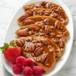 - Serve: Arrange the cooked French toast slices on a serving platter. Generously spoon the warm caramel pecan and bacon sauce over the top. Serve immediately for best results.