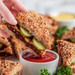 Slip a dill pickle chip into each gap between the folded dough pieces. These pickles aren’t just a cute garnish—they bring a refreshing crunch and tang that balances the richness perfectly.