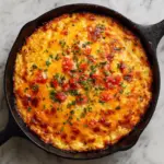 This Cheesy Taco Dip is a crowd-pleasing appetizer featuring seasoned ground beef layered over a creamy blend of cream cheese and sour cream, topped with melted cheddar and Monterey Jack cheeses, fresh tomatoes, black olives, and green onions. Baked until bubbly and served warm with tortilla chips, it’s perfect for parties and game days.