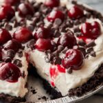 - Serve and Garnish: Before serving, optionally top with whipped cream, chocolate shavings, and extra maraschino cherries. Slice and enjoy your delicious Cherry Chocolate Chip Ice Cream Pie!