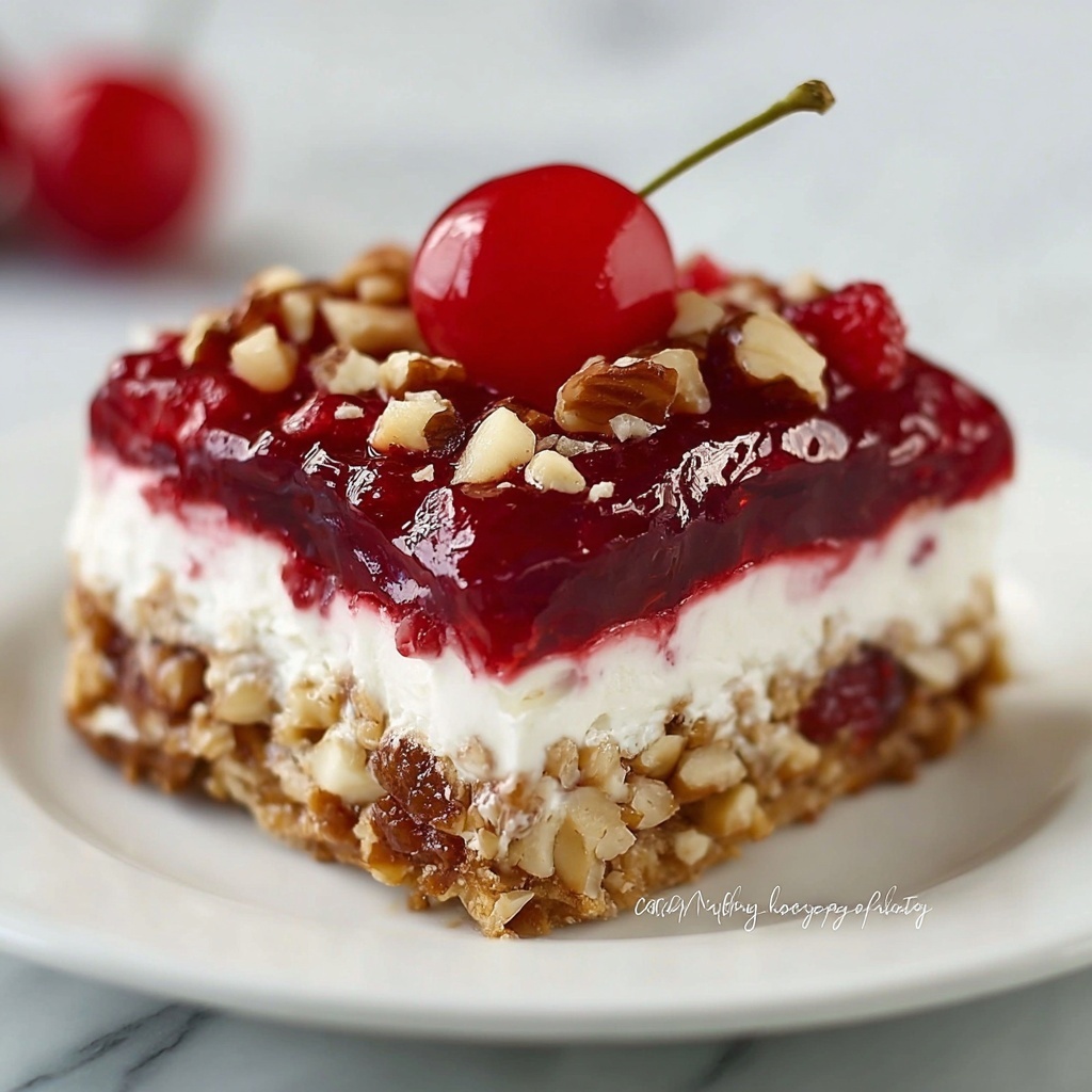 Cherry Pretzel Squares are a delightful no-bake dessert featuring a crunchy salted pretzel crust topped with a creamy sweetened cream cheese layer and luscious cherry pie filling. Finished with an optional sprinkle of chopped pecans, this treat is perfect for parties or a refreshing summer dessert.