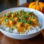 This vibrant Chicken and Pumpkin Thai Curry combines tender chicken pieces with sweet, creamy pumpkin cooked in a rich coconut milk and fragrant red curry paste sauce. Enhanced with fresh Thai basil, cilantro, and a touch of lime, this flavorful dish offers a perfect balance of spicy, sweet, and savory notes. Served over jasmine rice, it’s a comforting gluten-free and dairy-free main course ideal for a satisfying weeknight meal.