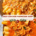 This comforting Chicken Parmesan Soup blends all the flavors of the classic Italian dish into a hearty, cheesy soup. Tender shredded rotisserie chicken, penne pasta, and a rich tomato broth come together with melted mozzarella and Parmesan cheese, finished with fresh basil for a perfect weeknight meal.