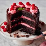 This rich and decadent chocolate cake is layered with a smooth chocolate ganache and topped with fresh raspberries for a perfect balance of sweetness and tartness. Moist and fluffy, it combines classic chocolate flavors with a glossy ganache finish, making it an ideal dessert for celebrations or any chocolate lover’s craving.