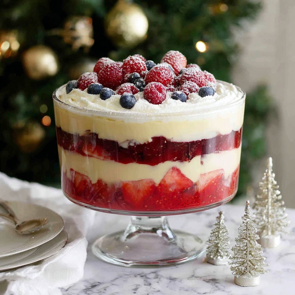 A festive and visually stunning Christmas Trifle featuring layers of moist Madeira cake soaked in fruit liquor or juice, fresh berries, a smooth gelatin cranberry layer, rich homemade custard, and fluffy whipped cream. Perfect for holiday gatherings, this dessert combines traditional flavors with a vibrant presentation to delight 10 to 14 guests.