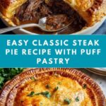 This Classic Steak Pie features tender beef stew meat cooked in a savory mushroom gravy, all encased in a flaky puff pastry crust. Perfectly browned and baked to golden perfection, this comforting dish is ideal for a hearty meal that serves four.
