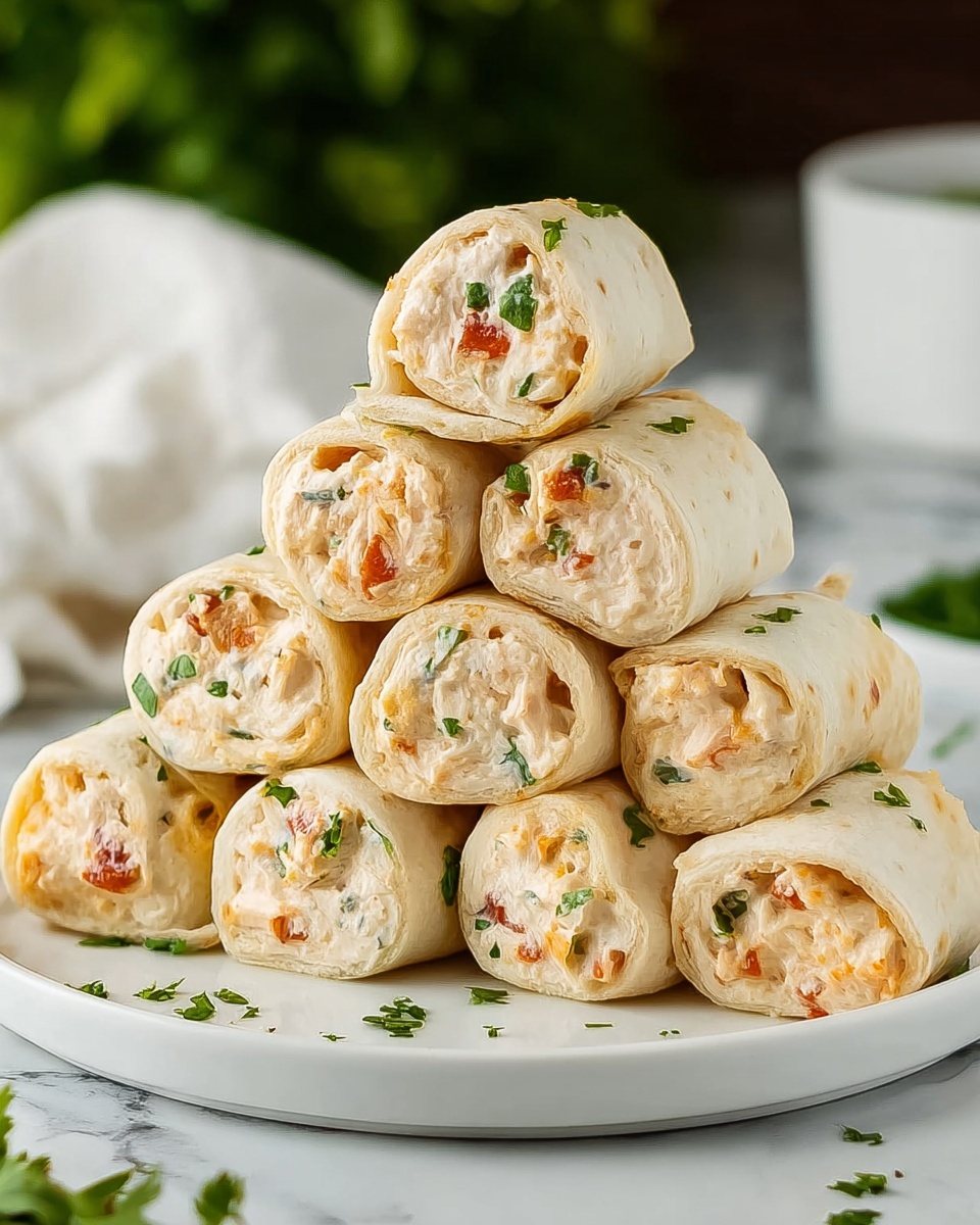 Try substituting the cream cheese with a lighter version or Greek yogurt, and use a low-fat ranch dressing to cut down on calories. Opting for whole wheat tortillas also adds fiber and makes the snack a bit more wholesome.