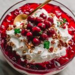 This Cranberry Jello Salad is a delightful and festive dessert combining fruity gelatin with a creamy, tangy cream cheese topping and crunchy pecans. Perfect for holiday gatherings or any special occasion, this salad offers a refreshing blend of cranberry, pineapple, and nutty flavors with a smooth, luscious texture.