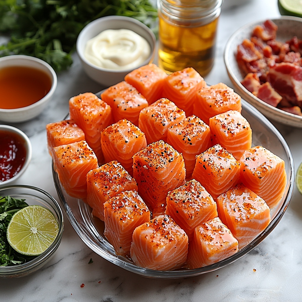 Start by cutting your fresh salmon into bite-sized cubes, ready for that perfect crisp. Place them in a bowl and coat generously with buttermilk to help tenderize and add moisture. Give the salmon a light pinch of salt and pop it in the fridge to marinate for at least 15 minutes. This step is key because it locks in juiciness while prepping the fish to hold onto the crunchy coating like a pro.