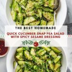 A refreshing and crunchy cucumber and sugar snap pea salad tossed in a flavorful Asian-inspired dressing with garlic, soy sauce, and chili oil. This no-cook, quick-to-prepare salad is perfect as a light side dish or appetizer, offering a vibrant combination of textures and bold flavors.