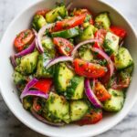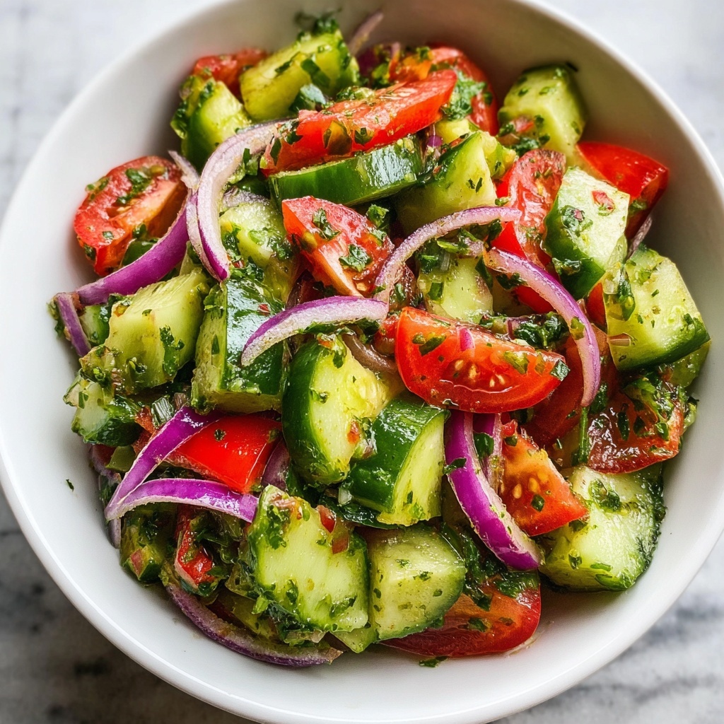 A fresh and vibrant Cucumber Tomato Avocado Salad perfect for a quick, healthy side dish or light meal. This no-cook salad combines juicy Roma tomatoes, crisp English cucumber, creamy avocado, and zesty lemon dressing for a refreshing flavor experience.