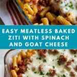This delicious meatless baked ziti features tender cooked pasta tossed with sautéed spinach and mushrooms, creamy ricotta and goat cheeses, and rich spaghetti sauce, then baked to bubbly perfection with melted mozzarella on top. A hearty and comforting vegetarian casserole perfect for a family dinner or potluck.