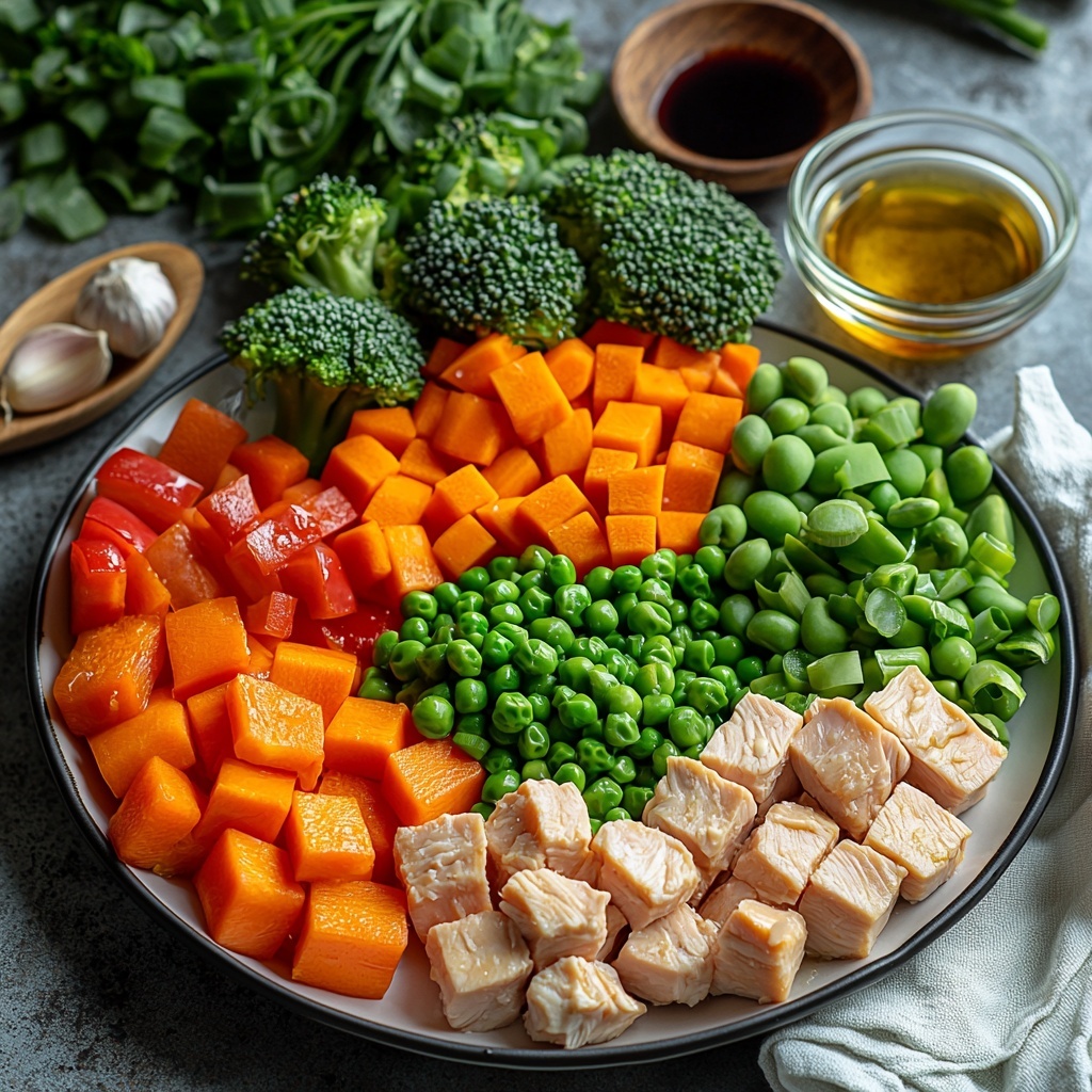 Return the cooked chicken to the pan with the veggies. Pour the teriyaki sauce over everything and toss well to coat all ingredients evenly. Let it heat through, allowing the sauce to cling lovingly to every piece. Just before serving, fold in the chopped green onions and green peas for an extra pop of freshness and sweetness.
