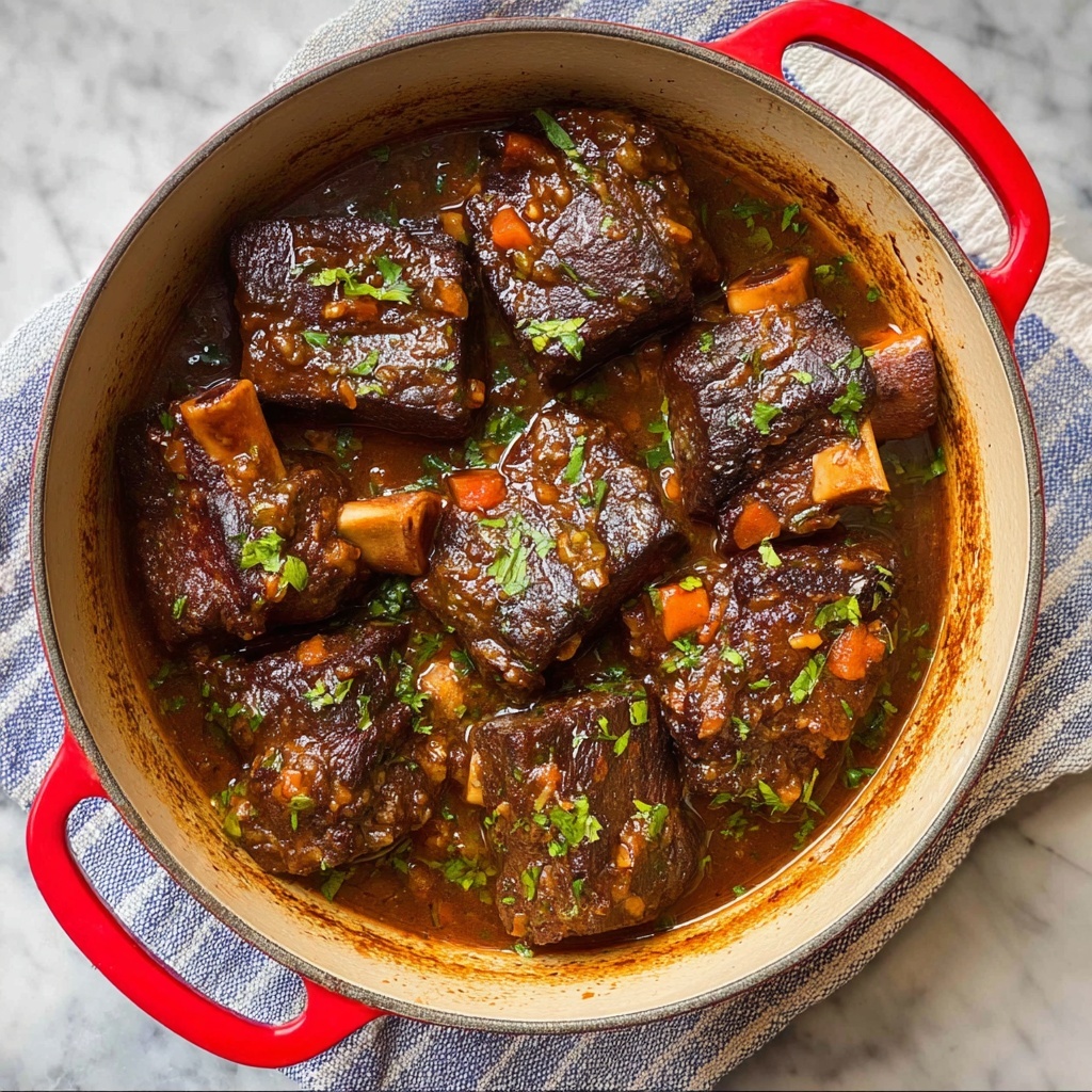 - Finish and Serve: When ribs are tender, carefully remove them from the Dutch oven. Stir the glaze mixture into the cooking liquid in the pot and simmer uncovered for 10-15 minutes until the sauce thickens slightly. Return the ribs to the pot and coat them well with the sauce before serving.
