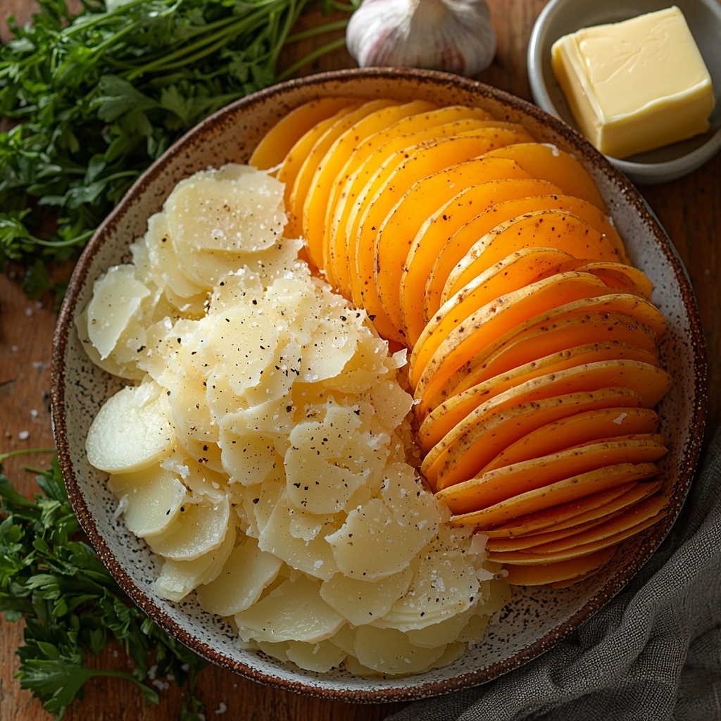In a small saucepan over medium-high heat, melt the butter and sauté the minced garlic just until fragrant. This step unlocks the garlic’s sweet, mellow flavor. Then, add the heavy cream along with salt and pepper, gently warming the mixture without letting it boil. This careful warming helps the flavors meld and prepares the luscious sauce that will soak into every potato layer.
