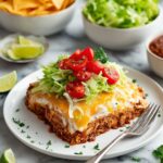 - Serve and Garnish: Cut the casserole into squares and garnish with fresh cilantro, sliced green onions, olives, tomatoes, avocado, guacamole, sour cream, salsa, and lime wedges to add vibrant flavor and color.