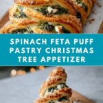 This Easy Christmas Tree Spinach Feta Bread is a festive and delicious appetizer perfect for holiday gatherings. Made with flaky puff pastry layered with a flavorful mixture of spinach, feta, mozzarella, and garlic, this visually stunning bread is shaped like a Christmas tree and baked to golden perfection. It’s simple to prepare and sure to impress your guests with its savory taste and charming presentation.