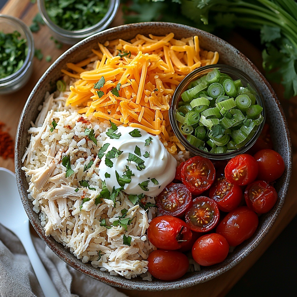 - Mix Main Ingredients: In a large mixing bowl, combine shredded chicken, cooked brown rice, sautéed onions with spices, green chiles, fire-roasted tomatoes, and Greek yogurt. Mix thoroughly until all ingredients are evenly incorporated.