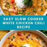 This Easy White Chicken Chili recipe is a comforting and creamy slow-cooked dish featuring tender shredded chicken, white beans, green chilies, and aromatic spices. Perfect for a hearty lunch or dinner, it’s finished with cream cheese and sour cream for a rich texture and garnished with fresh cilantro and optional toppings like shredded cheese, diced avocado, tortilla chips, and lime wedges.