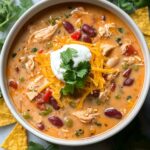 This Easy White Chicken Chili recipe is a comforting and creamy slow-cooked dish featuring tender shredded chicken, white beans, green chilies, and aromatic spices. Perfect for a hearty lunch or dinner, it’s finished with cream cheese and sour cream for a rich texture and garnished with fresh cilantro and optional toppings like shredded cheese, diced avocado, tortilla chips, and lime wedges.