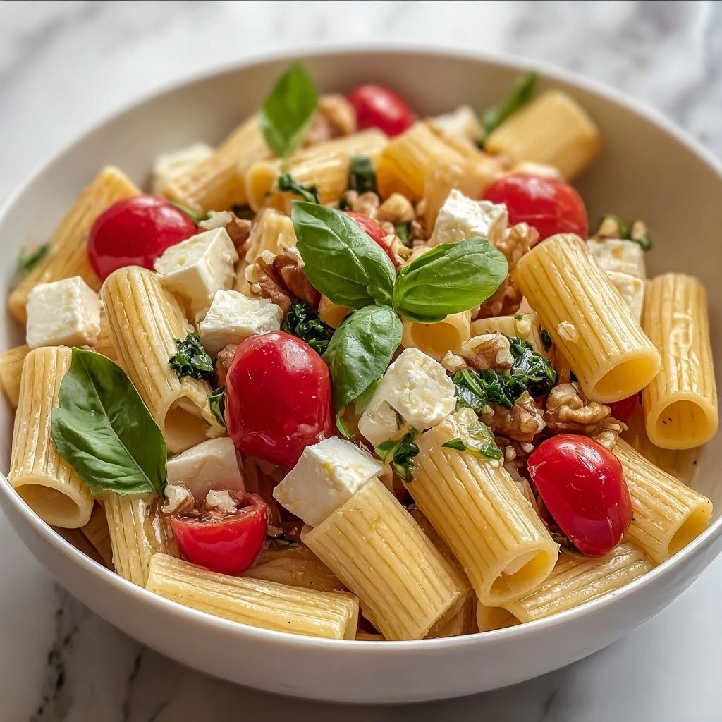 - Toss the Salad Ingredients: In a large mixing bowl, gently combine the cooled rigatoni, creamy feta cheese, sweet dried cranberries, crunchy toasted walnuts, fresh baby spinach, and diced red onion. Mix carefully to blend all flavors.