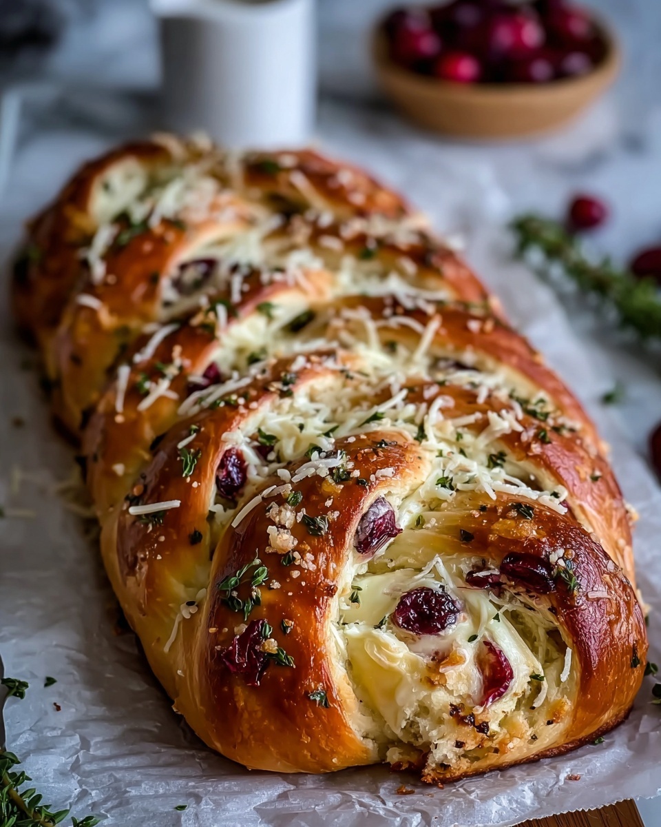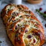 For a festive occasion, consider serving this Garlic Herb Sourdough Bread Stuffed with Brie & Cranberry Recipe on a wooden board surrounded by clusters of fresh cranberries and sprigs of rosemary or thyme. You can also cut it into smaller chunks for sharing at a casual gathering, turning it into a fun pull-apart centerpiece everyone will love.