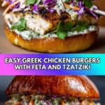 These Greek Chicken Burgers are a flavorful and healthy twist on the classic burger, featuring ground chicken mixed with feta cheese, fresh herbs, and traditional Greek seasonings. Juicy and tender, they are pan-cooked or grilled to perfection and served on toasted buns with refreshing toppings like cucumber, tomato, red onion, lettuce, and creamy tzatziki sauce. Perfect for a Mediterranean-inspired meal that’s easy to prepare and delicious.