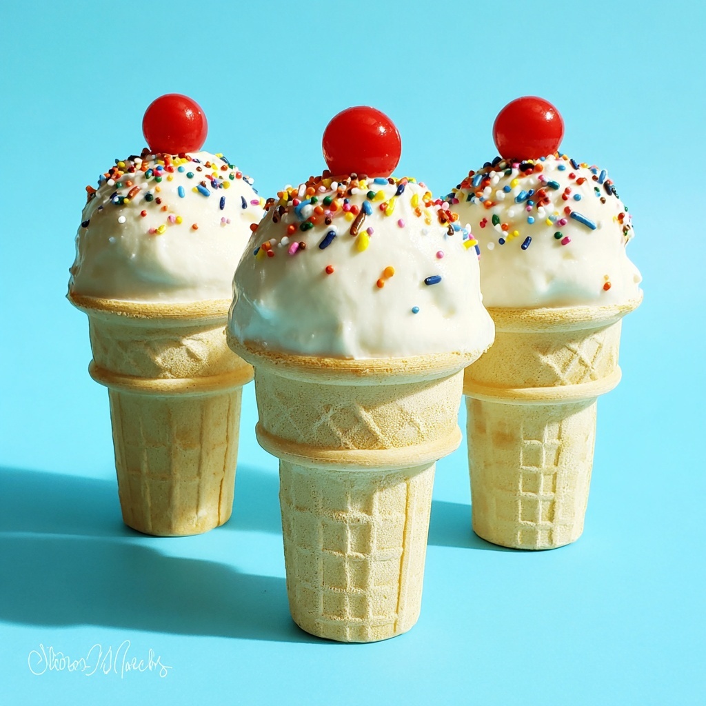 Delightful and fun-to-make Ice Cream Cake Pop Cones that combine moist cake crumbs mixed with creamy frosting, shaped into cake pops, and placed atop crunchy ice cream cones. Coated in smooth white candy chocolate and decorated with colorful sprinkles and red Sixlets, these treat cones are perfect for parties or a playful dessert.