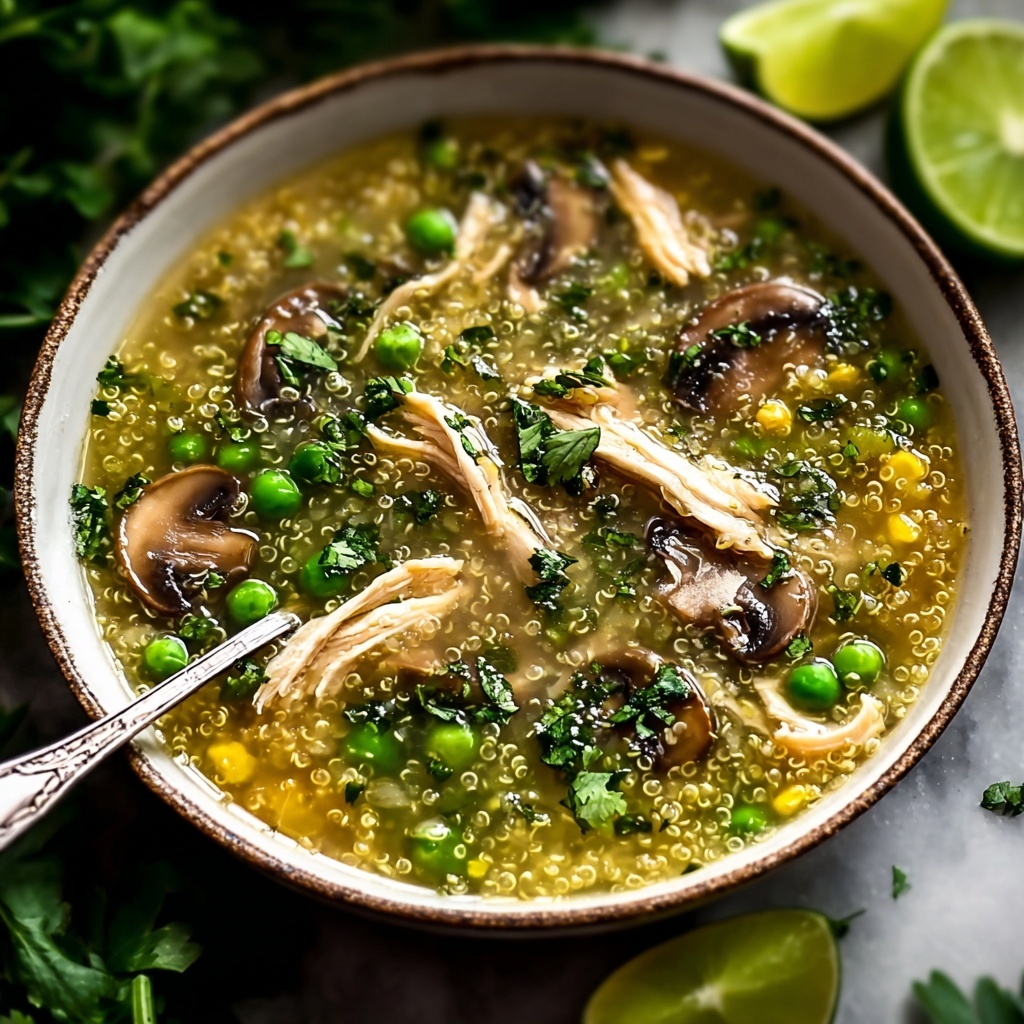 Right before serving, stir in the chopped mixed herbs and lemon juice. This final flourish brightens the entire dish, lending it that fresh green vibrancy which perfectly balances the richness from the chicken and mushrooms, making this truly an Irresistibly Flavorful Green Chicken Quinoa Soup with Herbs Recipe.