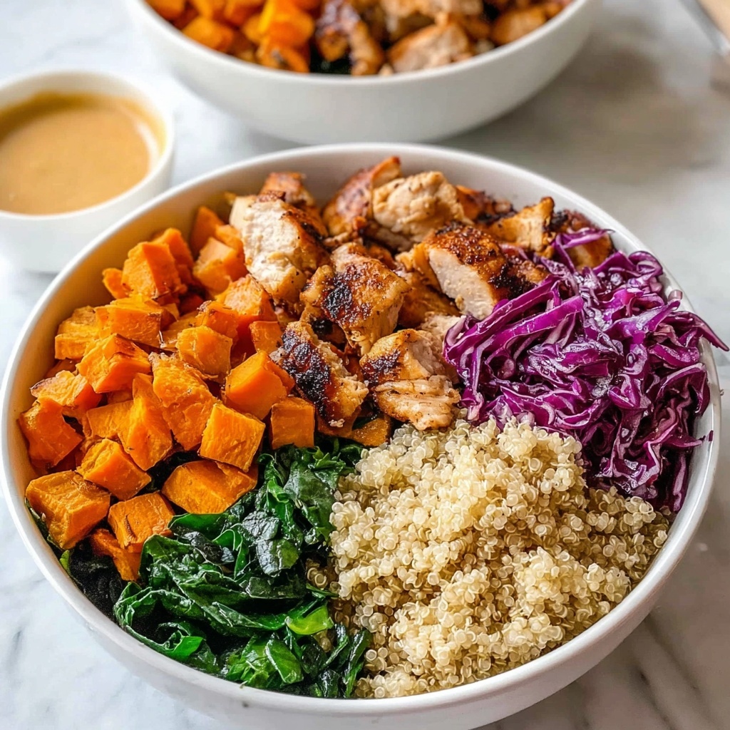 Start your bowl with a fluffy scoop of the garlic-infused quinoa. Arrange roasted sweet potatoes on one side, adding their warm sweetness and texture. Place the sliced, spice-coated chicken alongside them, and pile a generous amount of the vibrant coleslaw opposite the roasted potatoes. Drizzle the hot honey mustard dressing across the bowl, and finish with a handful of crispy fried onions as the crowning call for crunch and flavor burst.