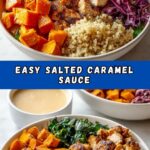 - Assemble the bowl: Start with a scoop of garlic quinoa as the base. Arrange roasted sweet potatoes on one side and sliced chicken thighs next to them. Add a generous portion of coleslaw on the opposite side. Drizzle the hot honey mustard dressing over the top. Finish with crispy fried onions for extra flavor and crunch.