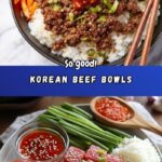 These Korean Beef Bowls are a quick and flavorful meal perfect for busy weeknights. Ground beef is simmered in a savory and slightly sweet sauce made from soy sauce, brown sugar, rice vinegar, and spices, then served over steamed white rice with fresh green onions, pickled or fresh vegetables, and optional spicy condiments for an authentic Korean-inspired bowl.