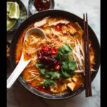 This comforting and flavorful Laksa Noodle Soup combines a fragrant and spicy coconut broth with tender chicken, vermicelli and hokkien noodles, tofu puffs, and fresh herbs. Originating from Southeast Asia, this dish melds rich laksa paste with aromatic ingredients like lemongrass, ginger, and garlic to create a vibrant meal perfect for chilly evenings or anytime you crave a spicy noodle soup.