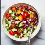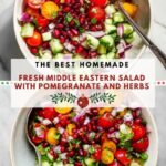 A vibrant and refreshing Middle Eastern salad featuring cherry tomatoes, cucumber, pomegranate arils, red onion, fresh herbs, and a tangy lemon-olive oil dressing. Perfect as a light side dish or a healthy snack.