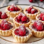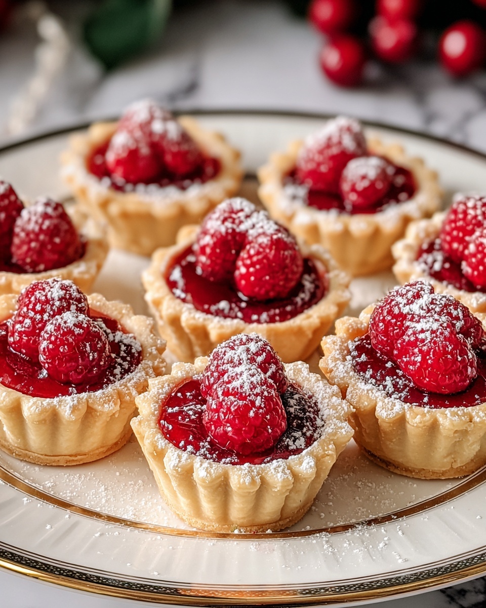 For a stunning display, arrange the tarts on a rustic wooden platter or a vintage porcelain plate. Add a few scattered fresh raspberries and small almond clusters around the plate for a charming touch. You could even drizzle a little raspberry sauce artistically around the platter to impress your guests visually and palate-wise.