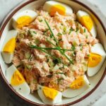 A quick and easy tuna salad recipe combining canned tuna, hard-boiled eggs, and a flavorful mix of mayonnaise and Dijon mustard. Perfect for a light lunch or snack, served chilled on toast, as a sandwich filling, or over greens.