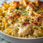 This Old-Fashioned Chicken and Noodles Casserole is a comforting and creamy home-cooked meal featuring tender chicken, wide egg noodles, and a rich blend of creamy soups and cheese, topped with a buttery, crunchy cracker crust. Perfect for a family dinner, this casserole combines classic flavors with simple ingredients, baked to a bubbly golden perfection in just 45 minutes.