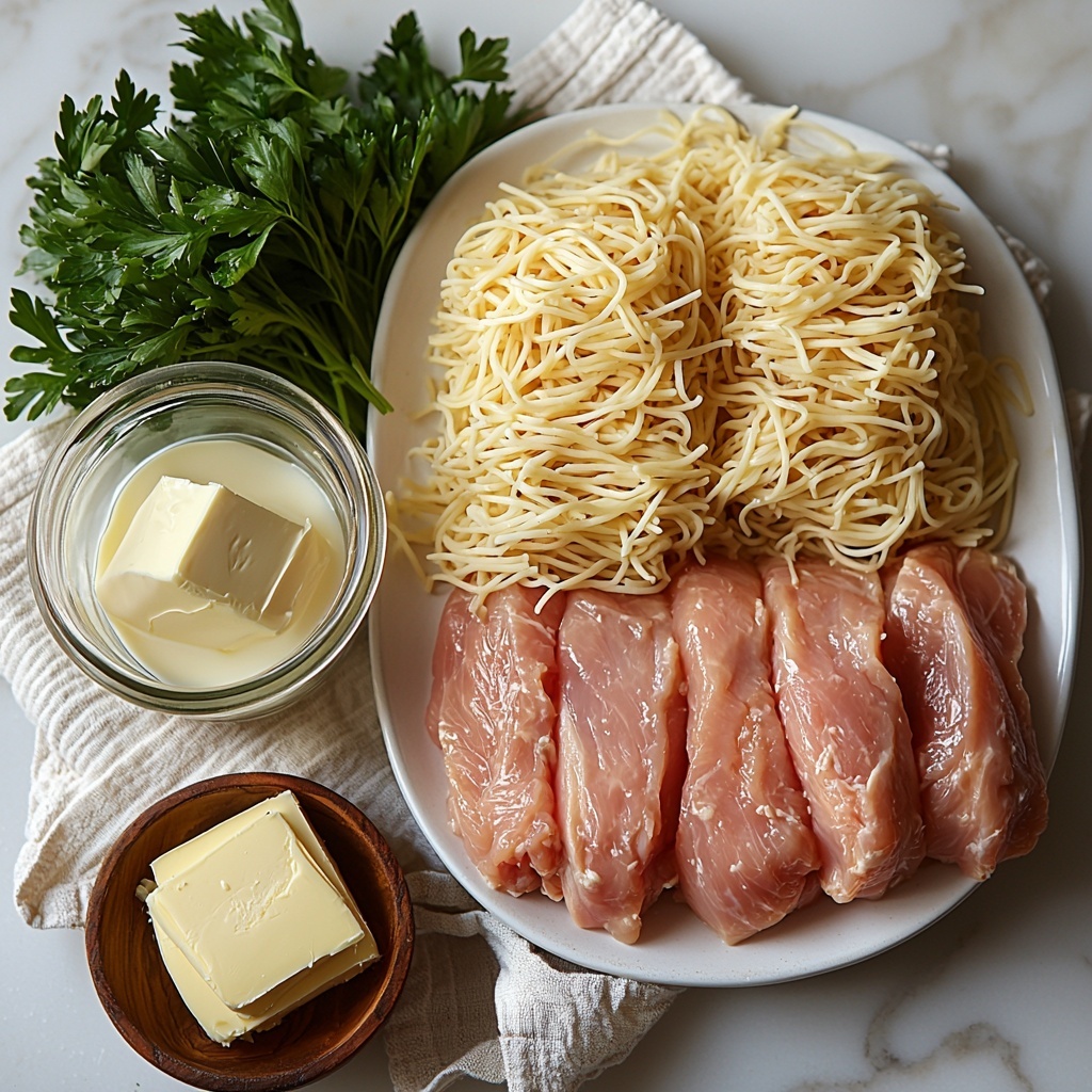 - 4 boneless, skinless chicken breasts: These provide juicy, tender protein that pairs perfectly with the creamy noodles.