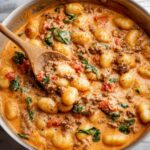 This One Pan Creamy Gnocchi with Sausage is a rich and comforting Italian-inspired dish perfect for a quick weeknight dinner. Tender potato gnocchi is simmered in a luscious creamy tomato sauce with savory Italian sausage, aromatic garlic, and fresh basil, all cooked together in one skillet for easy cleanup and maximum flavor.