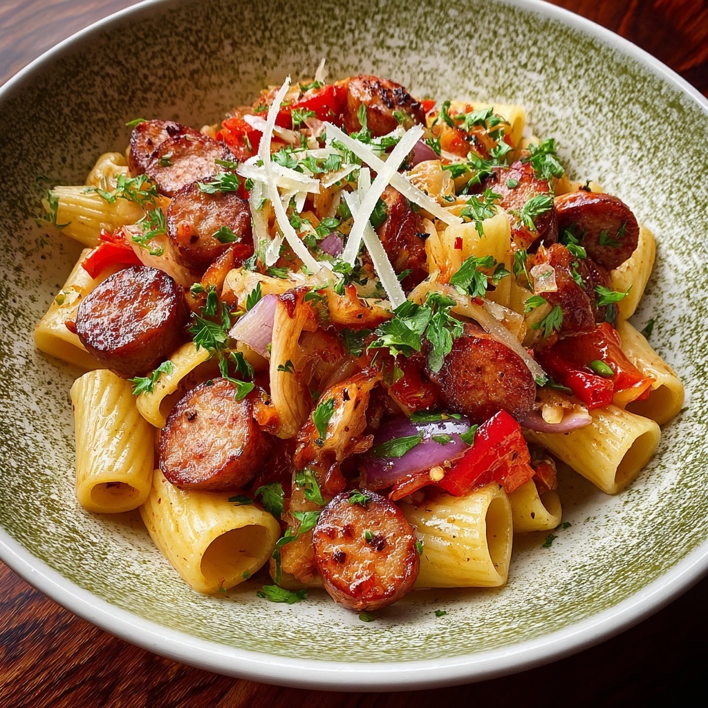 A flavorful one-skillet meal combining smoky sausage, spicy honey BBQ sauce, and tender pasta, perfect for a quick and hearty dinner with minimal cleanup.