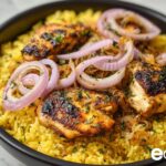 Once the rice is cooked, nestle the browned chicken back into the pan with the rice, allowing the fragrant spices and juices to mingle. This final touch ensures every grain of rice is infused with the savory goodness of the chicken’s marinade and pan drippings, creating a dish that feels rich and comforting in every forkful.